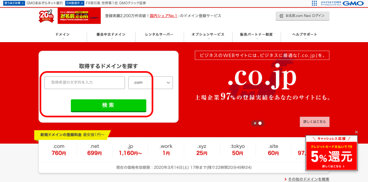 ①お名前ドットコムにアクセスし、先方希望ドメインを入力して検索。