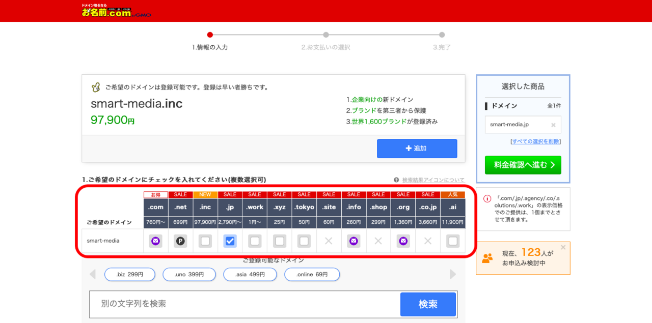 ②使用可能なドメインかどうかを確認し、購入したいドメインにチェックしたら「料金確認へ進む」をクリック。