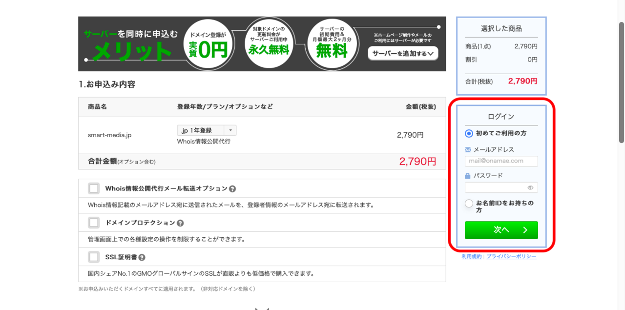 「既存のHPとは別に、新しくサイトを作りたい」という場合は、以下の手順で新規ドメインを取得してください。