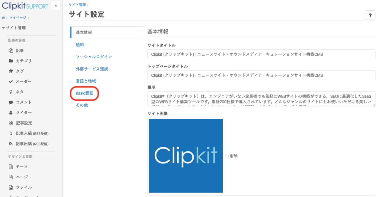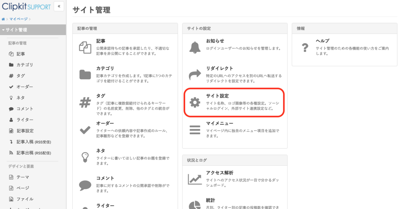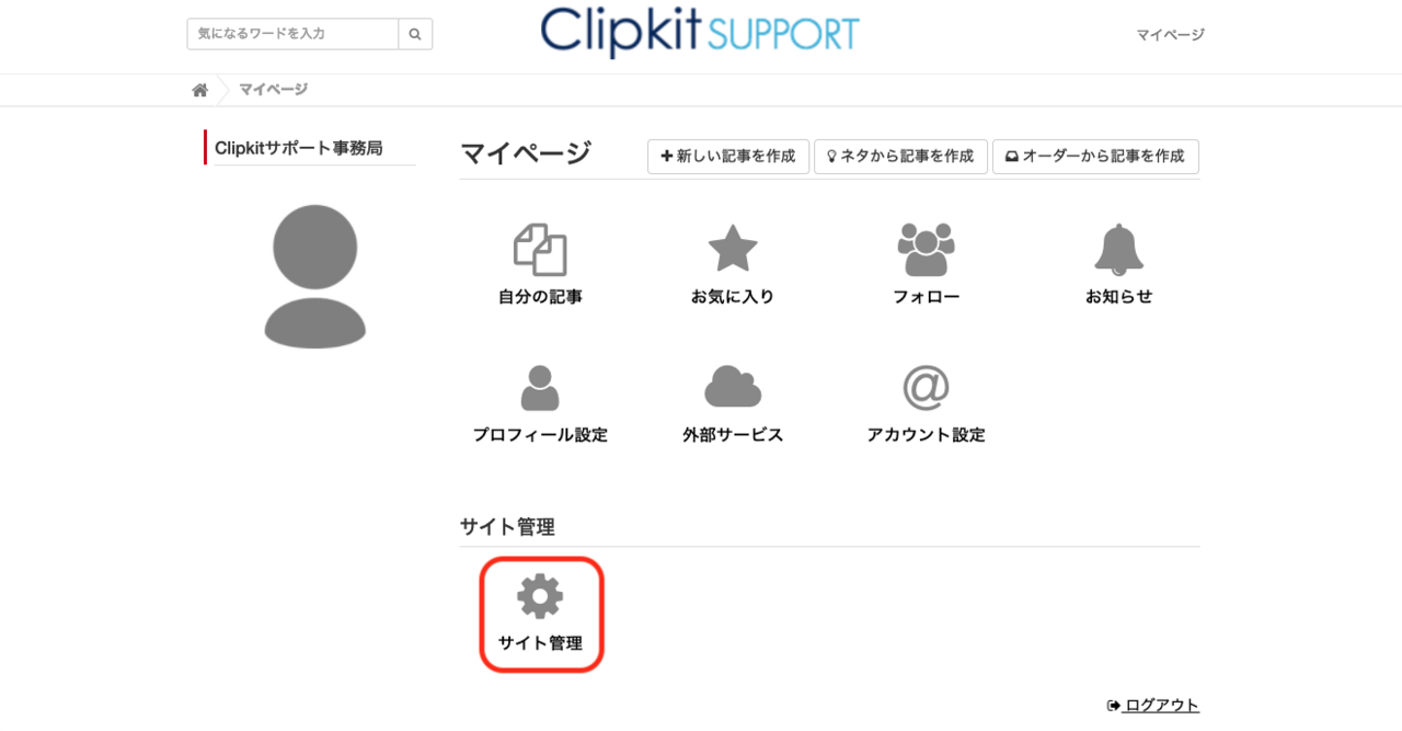 ①Clipkitのマイページにアクセスし、「サイト管理」をクリック。