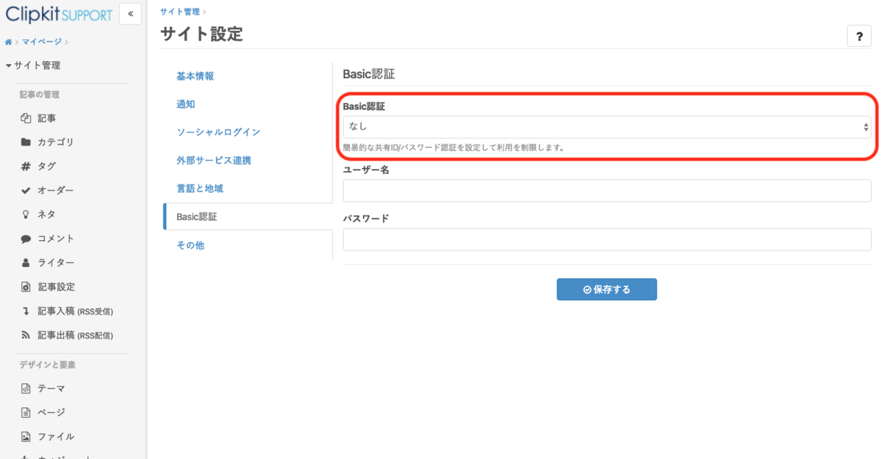 ④「Basic認証」を「なし」に設定し、「ユーザー名」と「パスワード」を空白にして「保存する」をクリック。