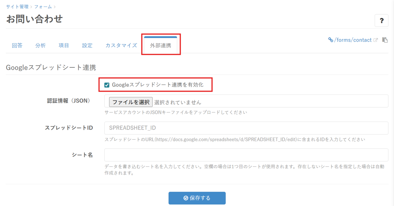 「Googleスプレッドシート連携を有効化」にチェックを入れます。