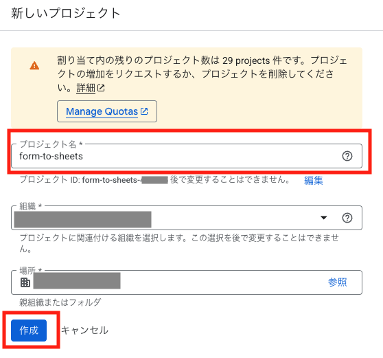 任意のプロジェクト名を入力して「作成」をクリックします。