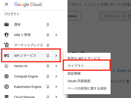ナビゲーションメニューから「APIとサービス」>「ライブラリ」をクリックします。
