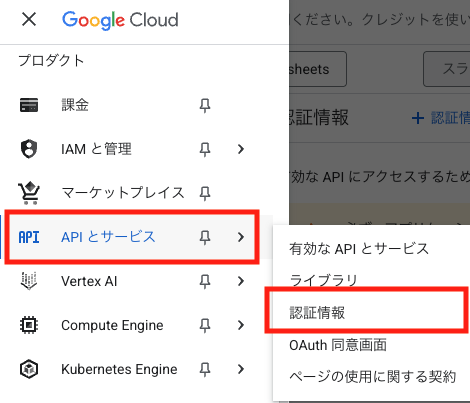 ナビゲーションメニューから「APIとサービス」>「認証情報」をクリックします。
