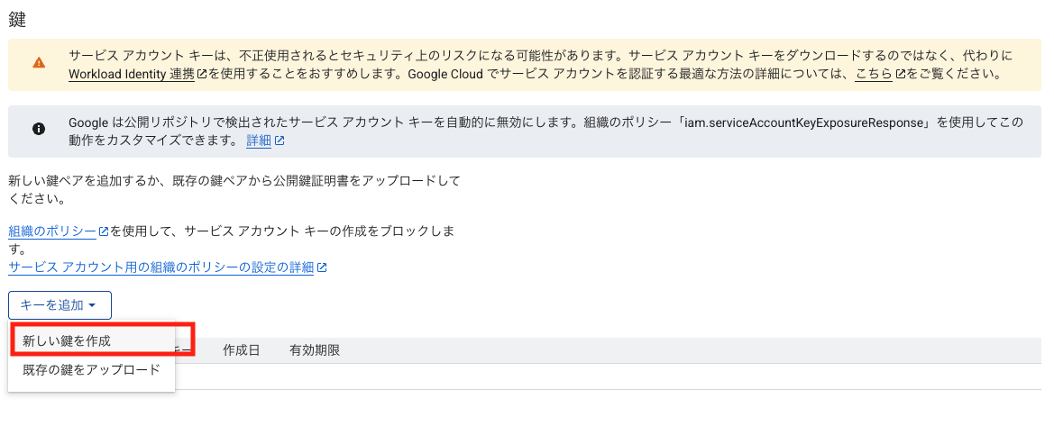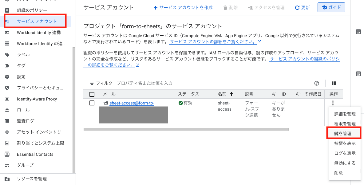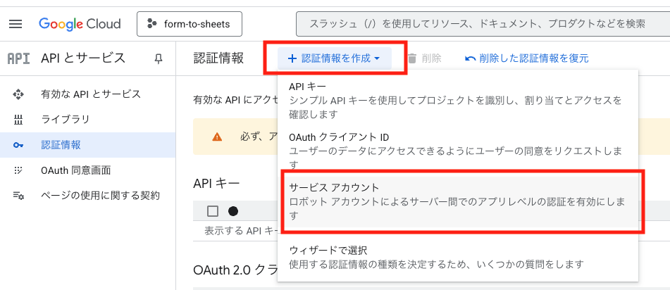 Googleスプレッドシートの連携には、サービスアカウントの秘密鍵(JSON形式)ファイルをアップロードする必要があるため、認証情報を取得します。