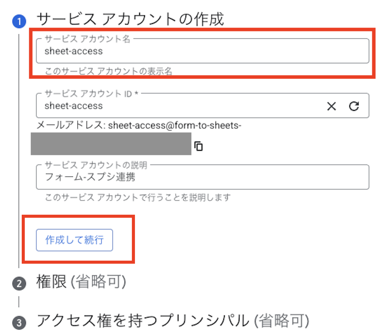 「サービスアカウント名」に任意の名前を設定し、「作成して続行」をクリックします。