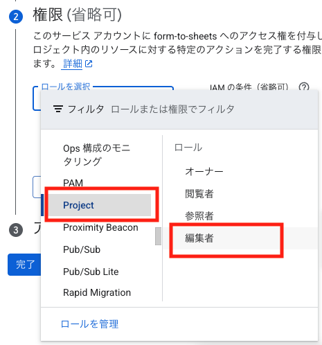「権限(省略可)」のフィルタから、Project>ロール:編集者 を選択して完了します。