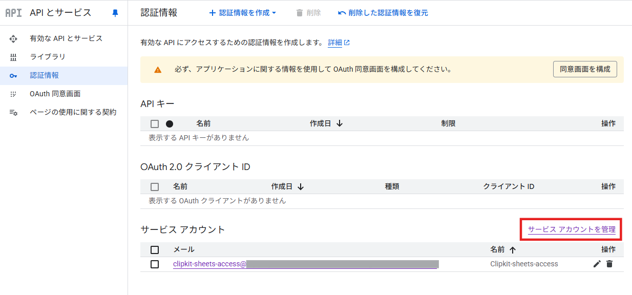 認証情報画面右下の「サービスアカウントを管理」をクリックします。