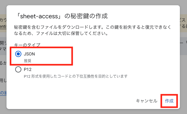 「JSON」を選択して「作成」をクリックすると、jsonファイル(xxx.json)がダウンロードされます。
