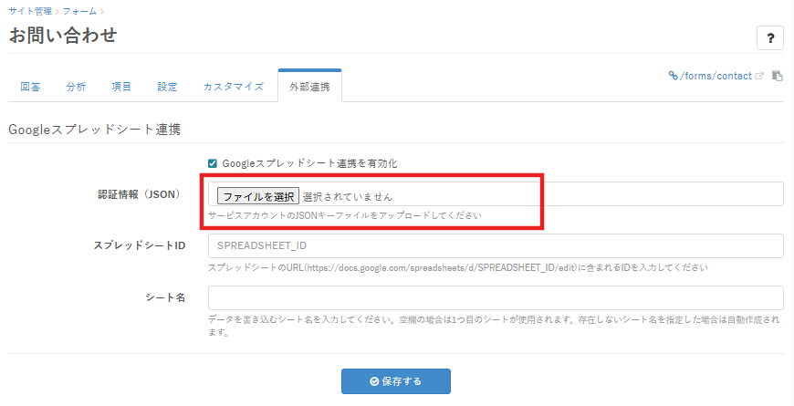 ④で取得したサービスアカウントの秘密鍵(JSON形式)ファイルを「外部連携」にアップロードします。