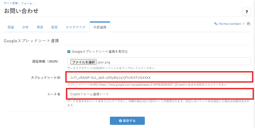 「シート名」には、データを書き込むシート名を入力して「保存する」をクリックしてください。