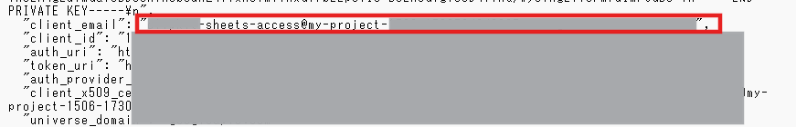 ④で取得したサービスアカウントの秘密鍵(JSON形式)ファイルをテキストエディット等で開き、