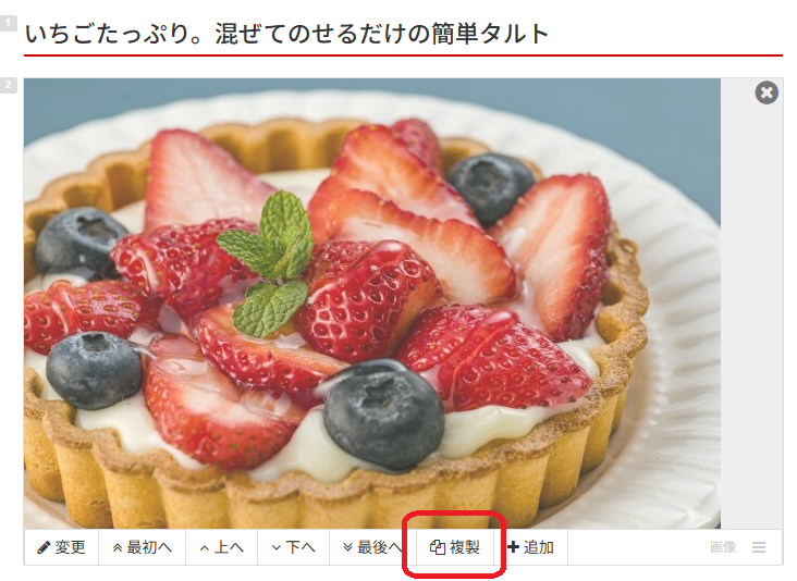 記事編集画面で、複製したいアイテムにカーソルを合わせ、アイテム下部に表示されるメニューから「複製」をクリックします。